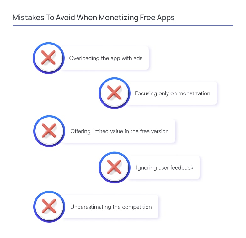 Overloading the app with ads. Too many ads or poorly placed ads can annoy users and drive them away from the app, reducing engagement and revenue potential.