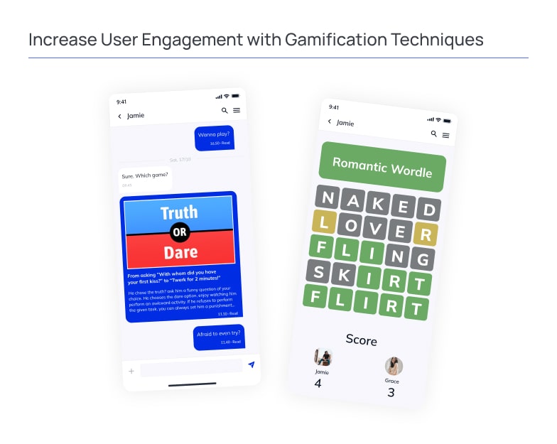 By providing a unique user experience, you can effectively increase app retention on a dating app. Gamification is one of the ways to enhance interaction between people. Playing games allows breaking the ice between users and helps them form a connection. You can make a game out of romantic intentions. For example, making people ask various questions to the potential suitors and choose which person or answer they prefer. Encouraging users to experiment with their interactions can increase loyalty.